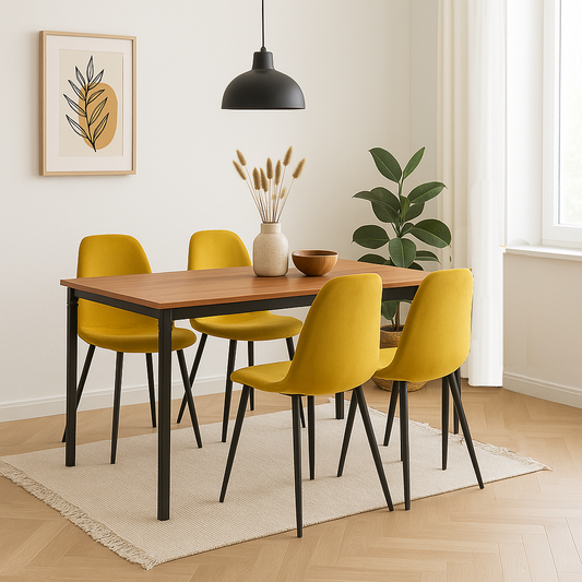 Mesa de comedor Sansa con 4 sillas Oxford - Nogal, Negro y Mostaza