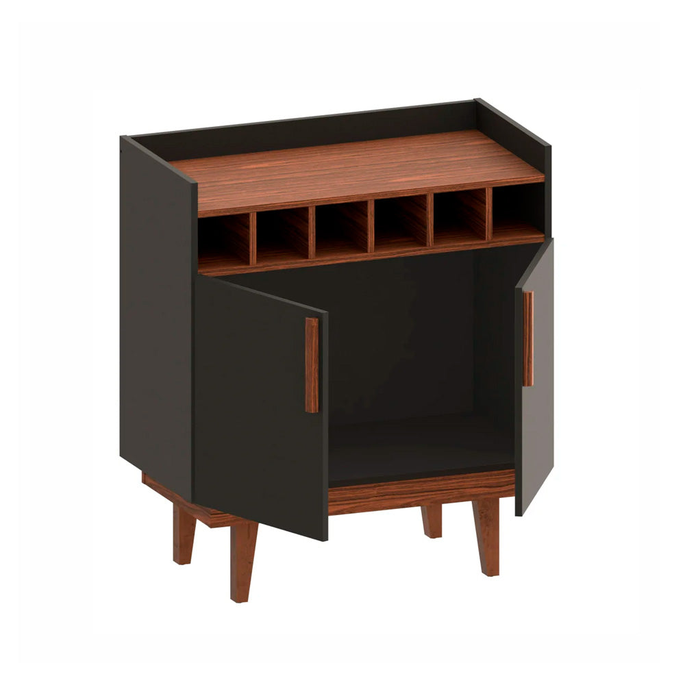 Bar fabricado en MDP de 15mm. Puertas batientes metálicas de 35 mm con sistema de cierre suave. Pies de madera de pino maciza.