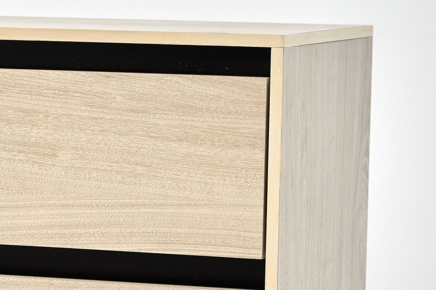 Mueble que se entrega armado. Comoda look nórdico de 6 cajones con corredera de extensión. Estructura de MDF de 12mm y frente de melamina nogal claro y fondo en melamina negra. patas de metal y desmontables. El producto viene armado menos las patas.