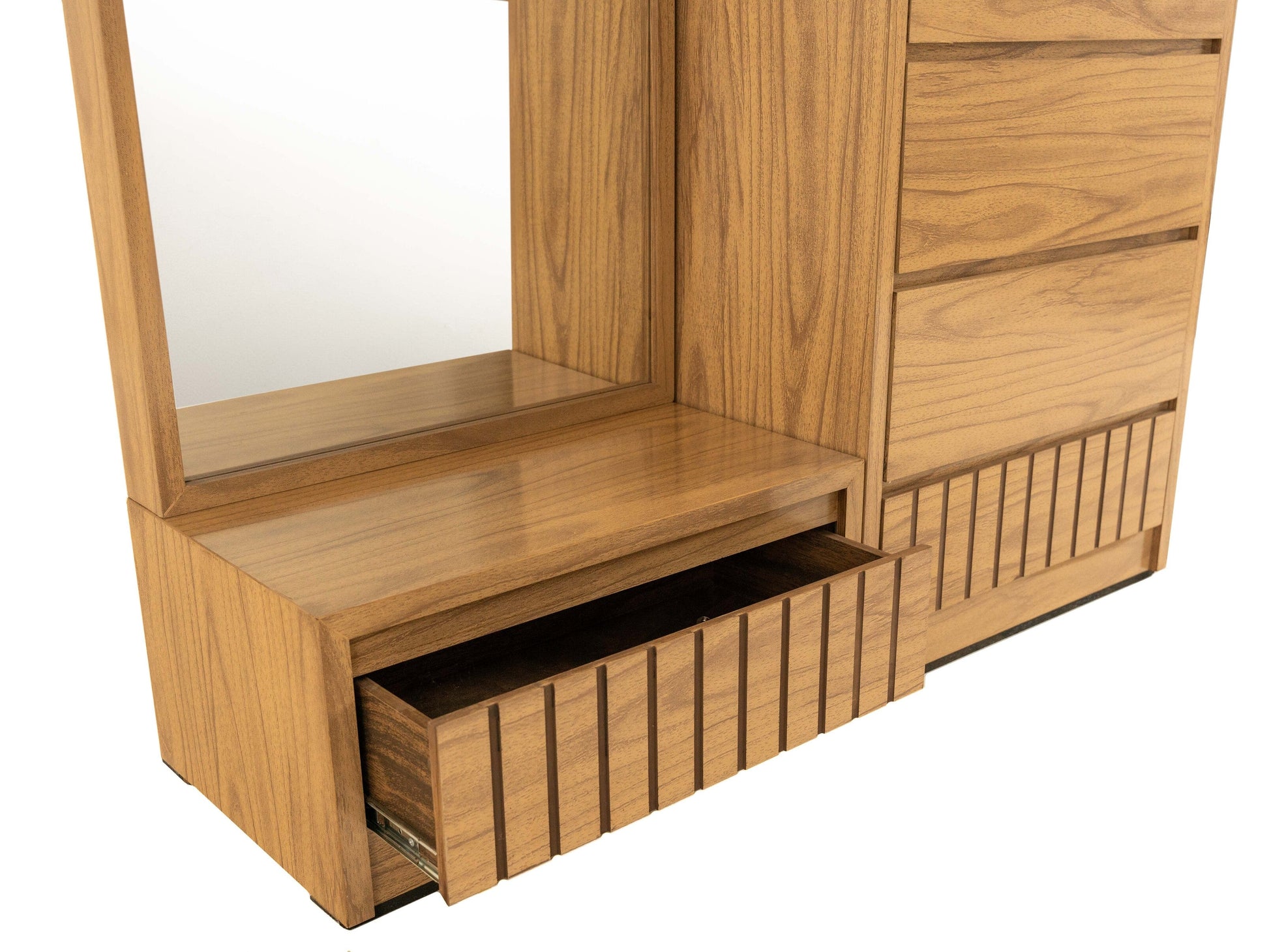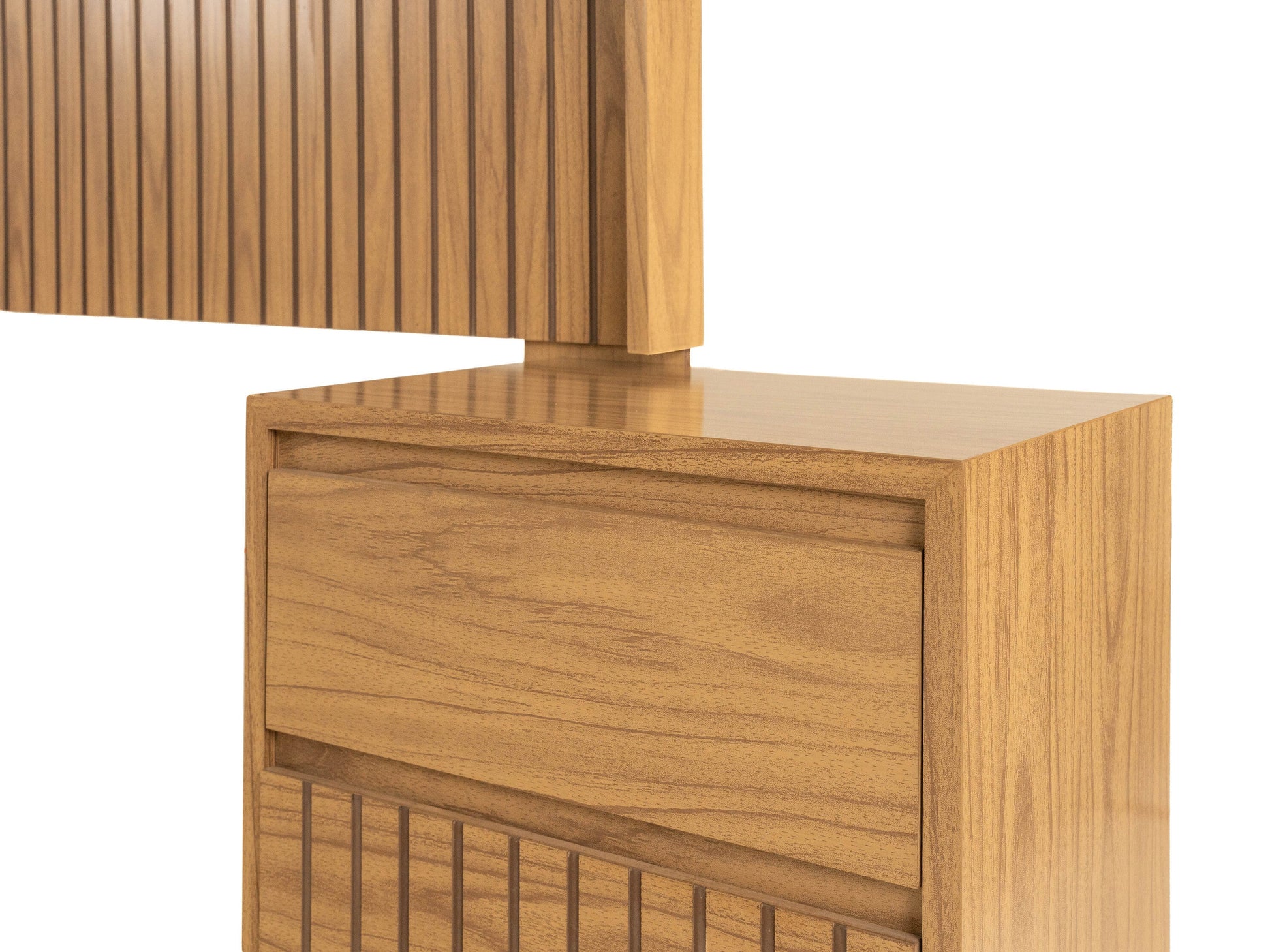 Recámara King Size de 5 Piezas con Cabecera, 2 Burós, Cajonera y Espejo Color Natural