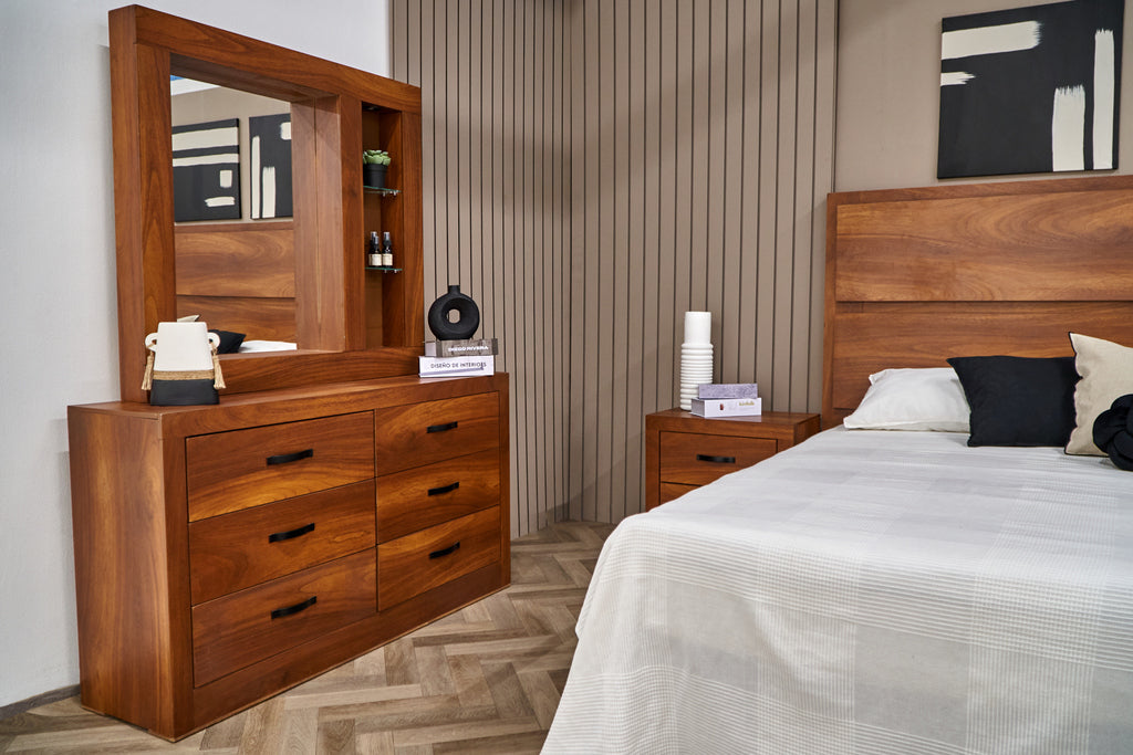 Descubre la fusión perfecta entre elegancia y diseño con este set de recámara completa, que incluye: una cabecera, ideal para un colchón tamaño king; dos burós, cuyo diseño versátil y almacenamiento eficiente mantiene la armonía y el orden; una cómoda y espejo que también funciona como vanity o tocador, proporcionando el espacio perfecto para maquillarse, arreglarse o simplemente prepararse para el día. Su diseño elegante y funcional aporta estilo y sofisticación al ambiente. Todos los productos fueron fabricados con materiales duraderos y un diseño atemporal. Se entregan completamente armados para un uso inmediato. Un conjunto perfecto para transformar tu dormitorio en un refugio con estilo y confort. No incluye base para cama ni colchón.