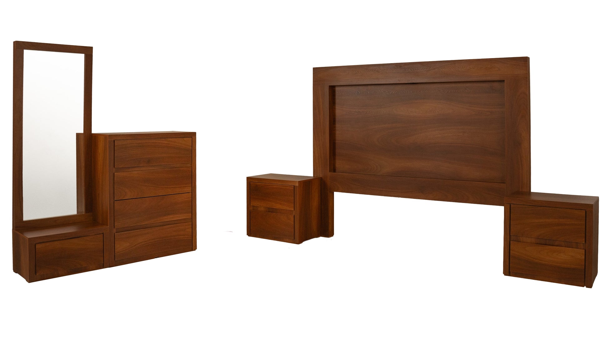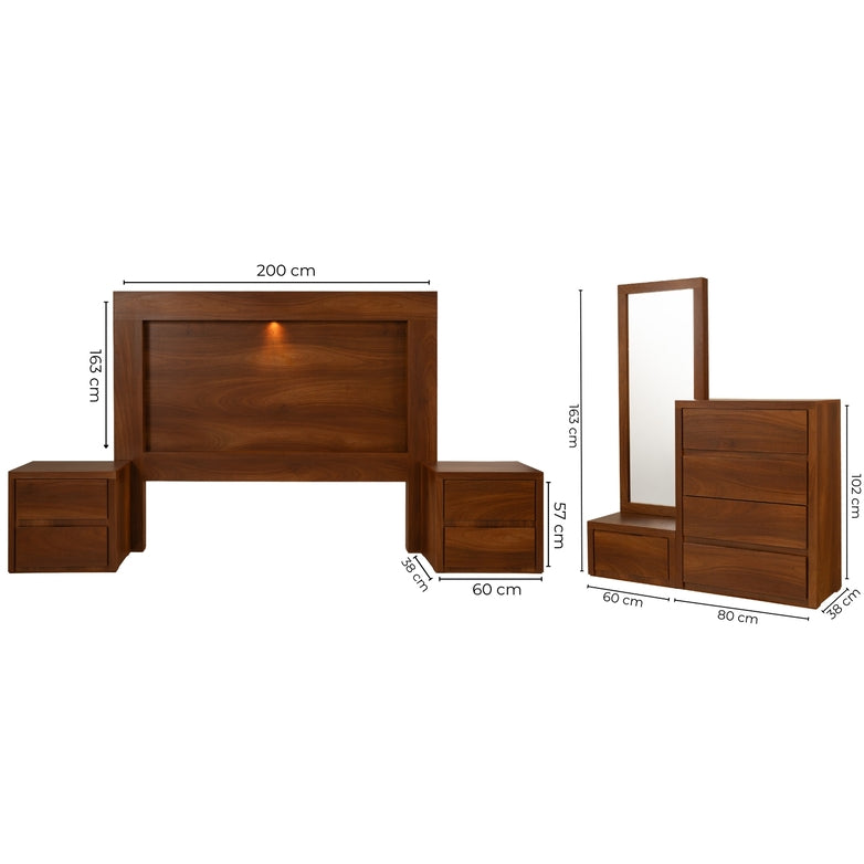 Descubre la fusión perfecta entre elegancia y diseño con este set de recámara completa, que incluye: una cabecera con luz integrada, ideal para un colchón tamaño king; dos burós, cuyo diseño versátil y almacenamiento eficiente mantienen la armonía y el orden; una cómoda y espejo que también funciona como vanity o tocador, proporcionando el espacio perfecto para maquillarse, arreglarse o simplemente prepararse para el día. Su diseño elegante y funcional aporta estilo y sofisticación al ambiente. Todos los productos fueron fabricados con materiales duraderos y un diseño atemporal. Se entregan completamente armados para un uso inmediato. Un conjunto perfecto para transformar tu dormitorio en un refugio con estilo y confort. No incluye base para cama ni colchón.