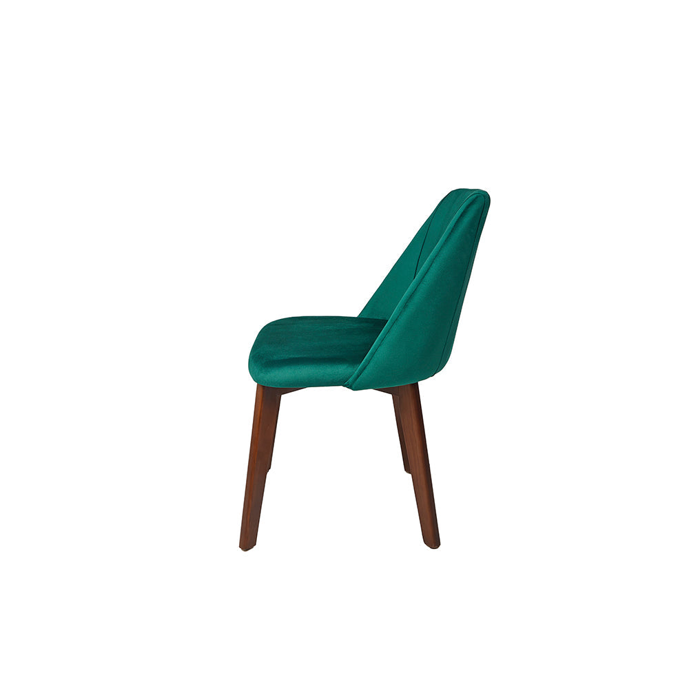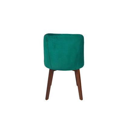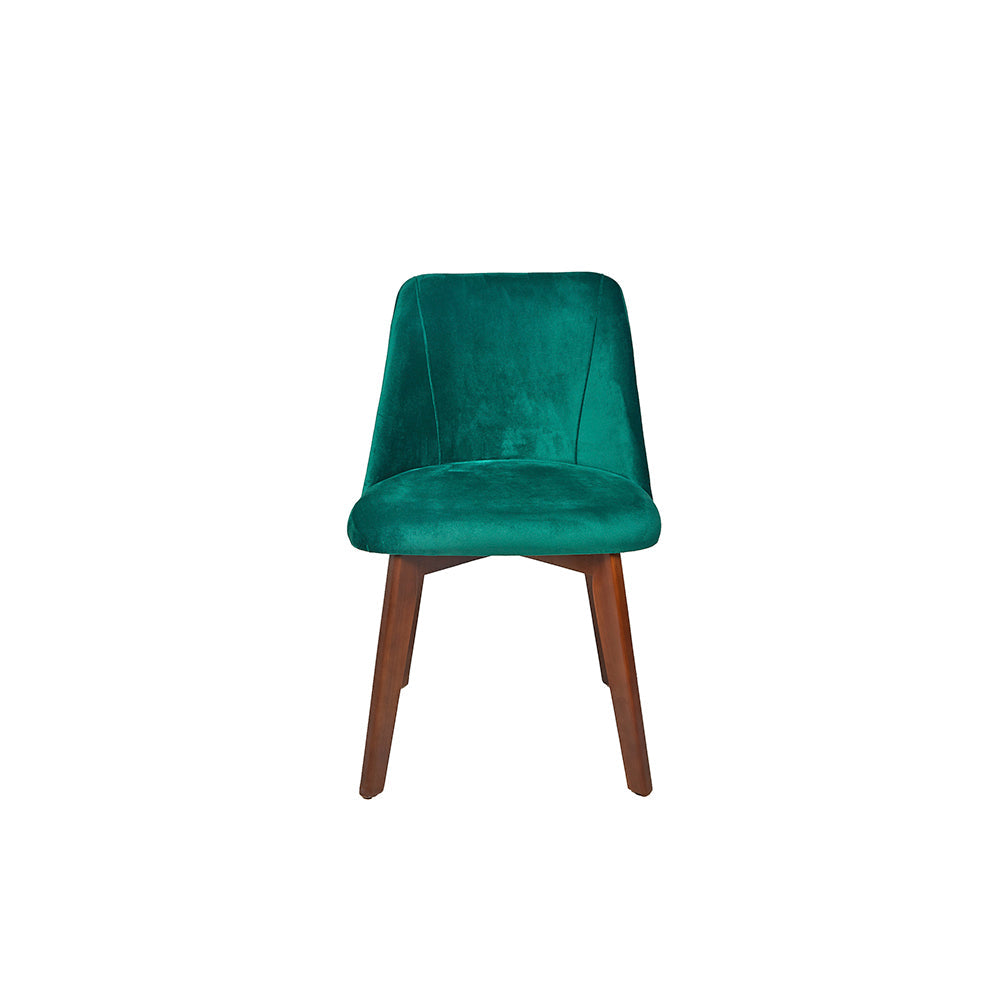 Silla tapizada en terciopelo con patas en pino acabado nogal.