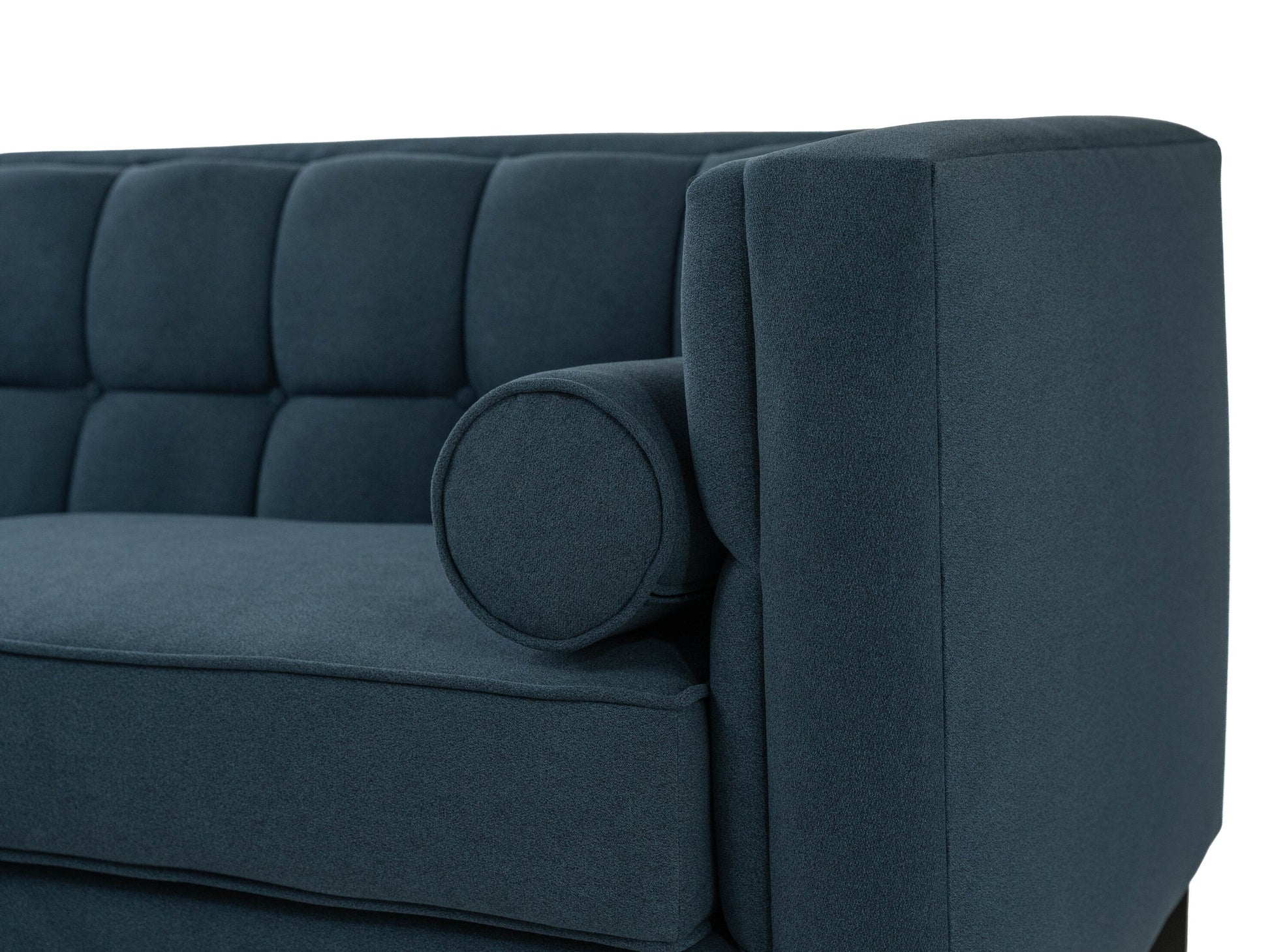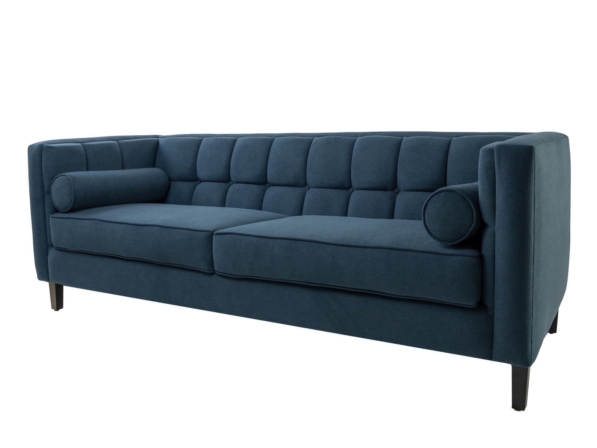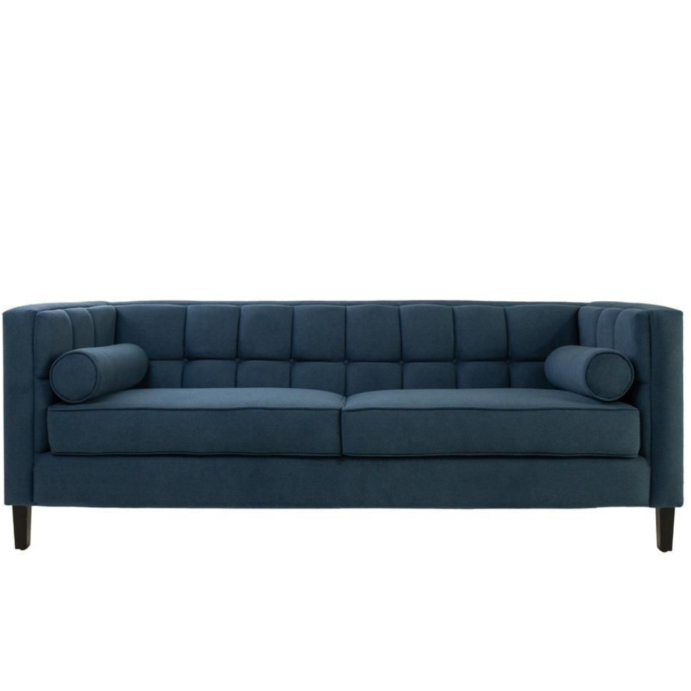 Sofá de 3 plazas con 2 cojines cilíndricos. Estructura de madera de pino de primera, horneada y sin nudos, con ensambles reforzados en esquinas y con cargadores adicionales. El ensamble impide la fatiga de la estructura evitando que el mueble rechine o incluso se pueda llegar a fracturar. El acojinamiento es de hule espuma que excede los 30kg de densidad, siendo 24kg el estándar recomendado. Las patas son de pino natural. Botón de capitonado.