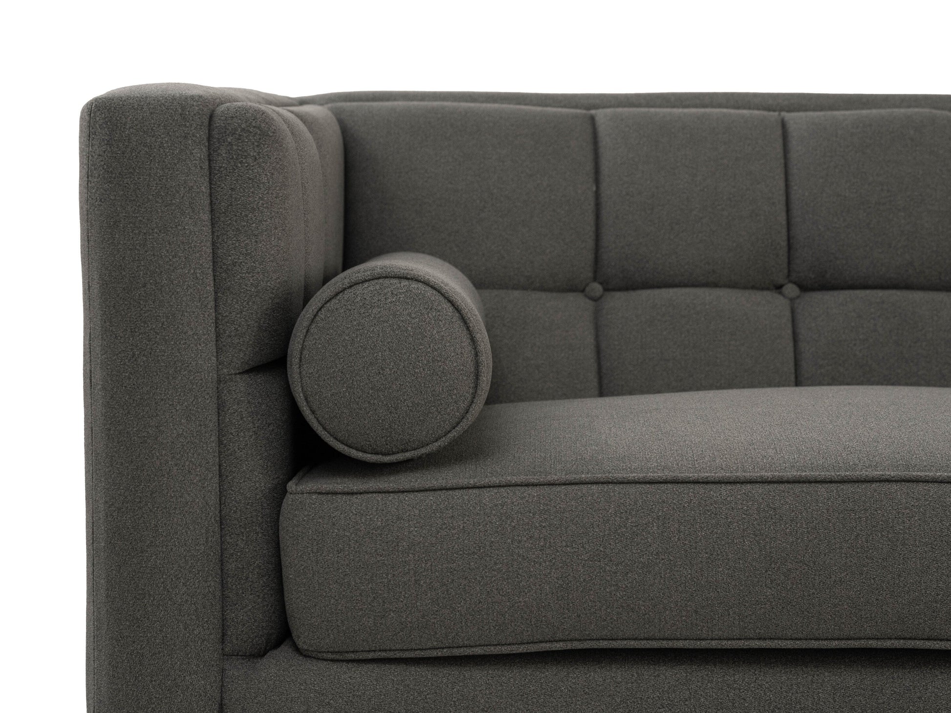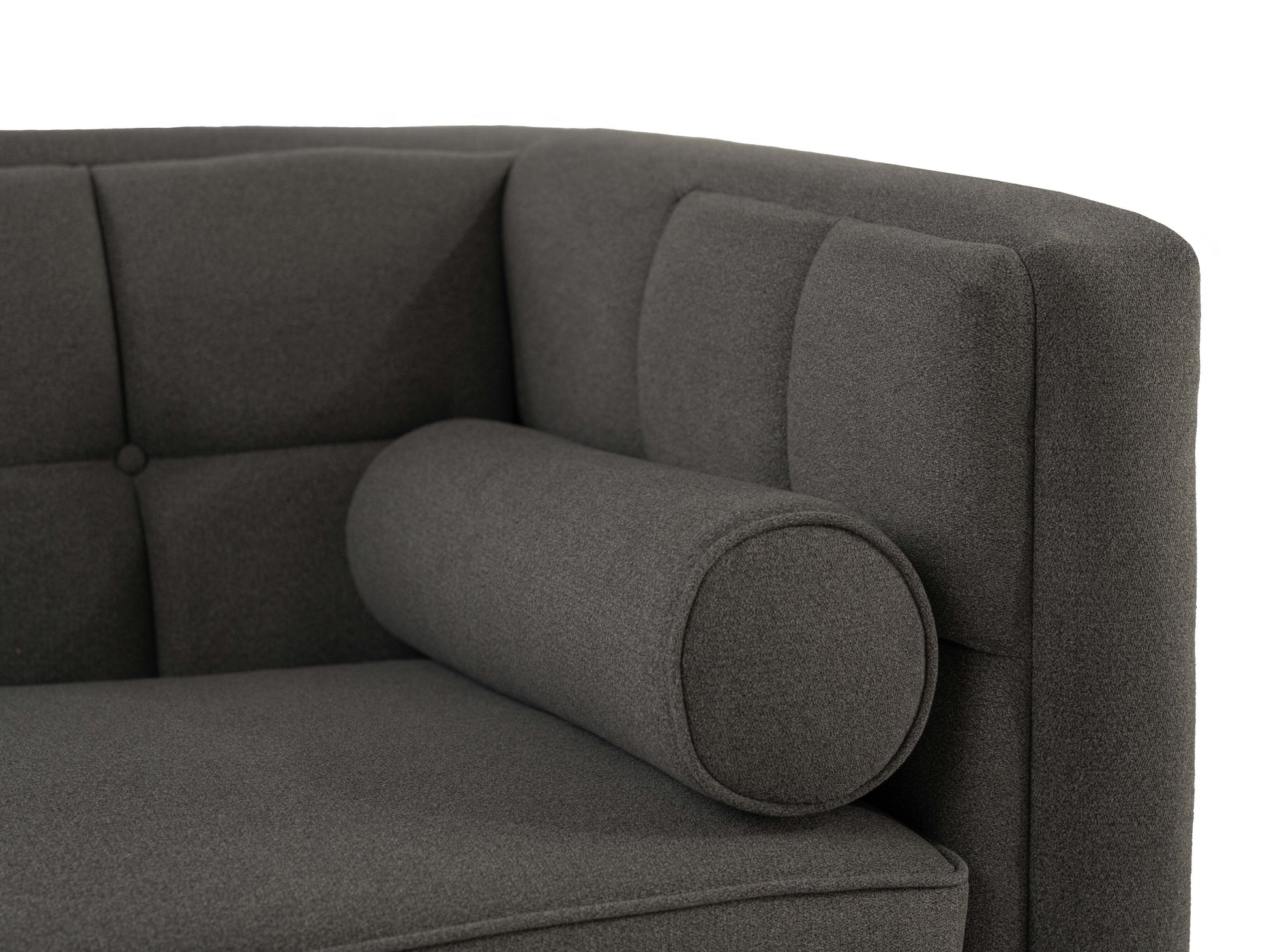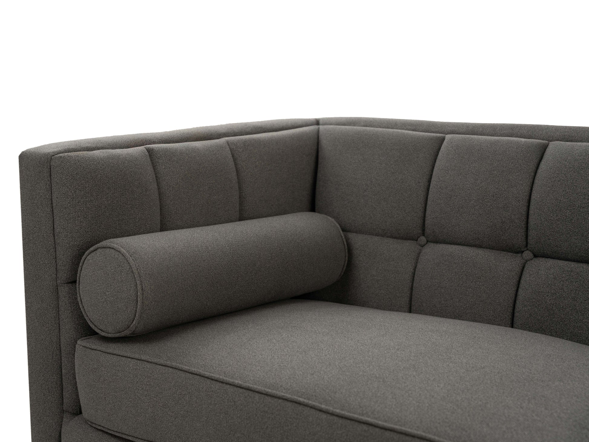 Sofá de 3 plazas con 2 cojines cilíndricos. Estructura de madera de pino de primera, horneada y sin nudos, con ensambles reforzados en esquinas y con cargadores adicionales. El ensamble impide la fatiga de la estructura evitando que el mueble rechine o incluso se pueda llegar a fracturar. El acojinamiento es de hule espuma que excede los 30kg de densidad, siendo 24kg el estándar recomendado. Las patas son de pino natural. Botón de capitonado.