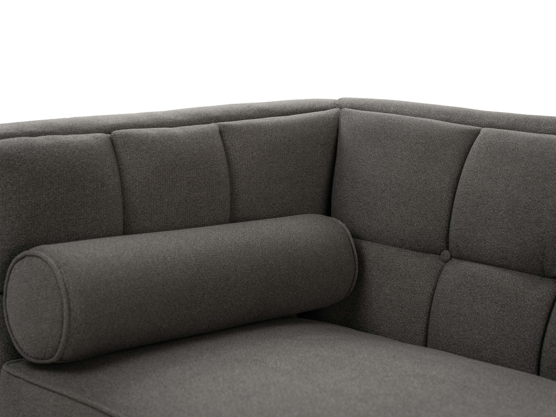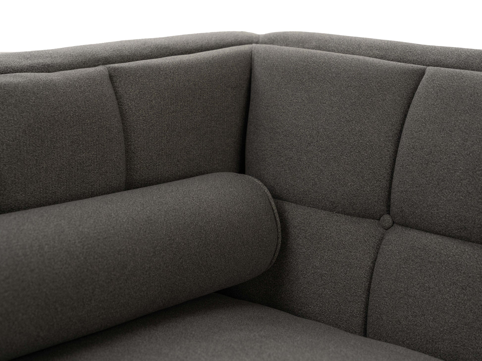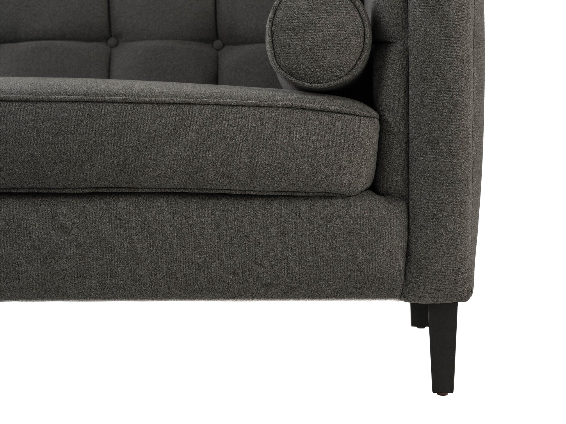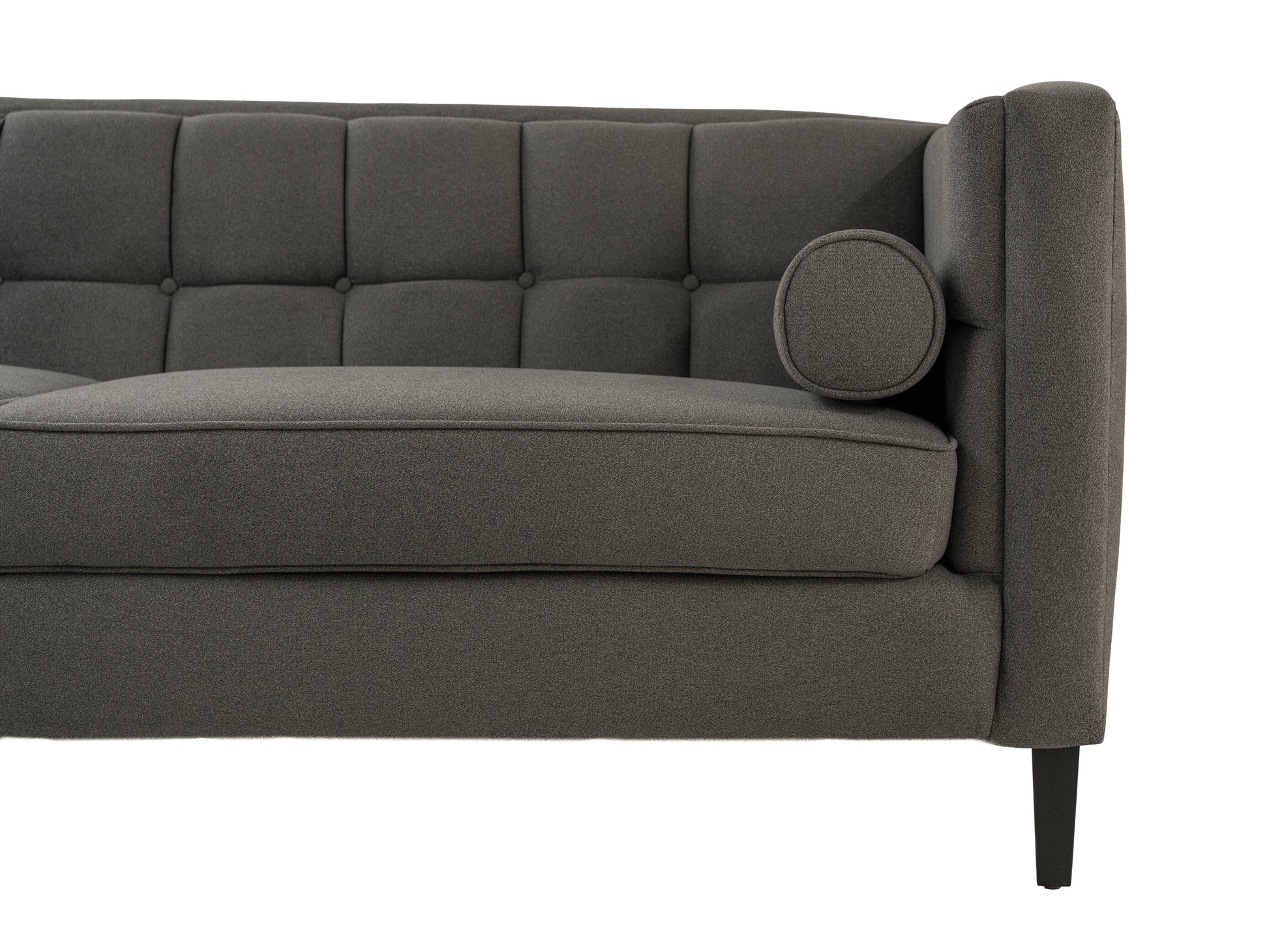 Sofá de 3 plazas con 2 cojines cilíndricos. Estructura de madera de pino de primera, horneada y sin nudos, con ensambles reforzados en esquinas y con cargadores adicionales. El ensamble impide la fatiga de la estructura evitando que el mueble rechine o incluso se pueda llegar a fracturar. El acojinamiento es de hule espuma que excede los 30kg de densidad, siendo 24kg el estándar recomendado. Las patas son de pino natural. Botón de capitonado.
